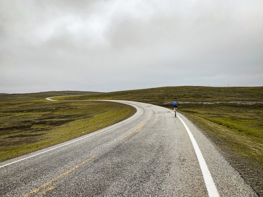 After Karášjohka, we have a few kilometers of climbing ahead of us, followed by a huge flat plain where only dwarf birches grow and a crazy headwind blows. My brother and I try to take turns at the front, but I’m much slower than my brother on my bike, so I end up hiding behind him and we continue like this for several dozen kilometers through this inhospitable landscape. Suddenly, mountains begin to rise up in front of us. But they are not mountains like we know from the Alps, for example. These look different. They are mountains typical of Norway. Suddenly, we descend into a valley. The wind is still blowing against us, and even though my bike computer shows a 5% descent, I have to push off to move at all. Here and there, we start to meet more cyclists who are also riding in expedition style. Compared to most of them, however, we are riding quite lightly. We wave to each other, and when they see the scooter, they give us a thumbs up in appreciation.