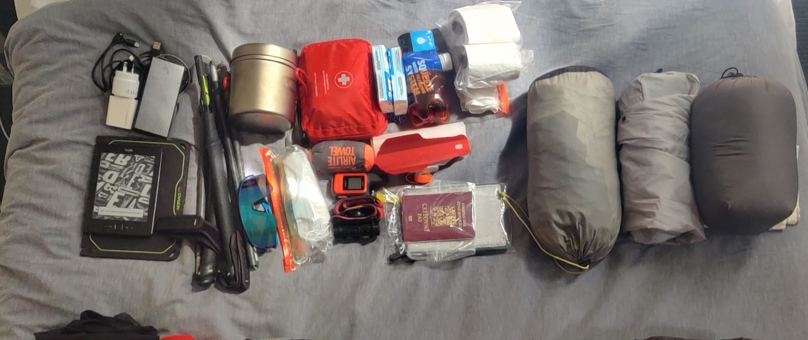- power banks (I had two, 10,000 mAh and 20,000 mAh, just to have one for my watch and the other for the phone. Keeping the watch charged was important for navigation; the phone was mostly for photos.)