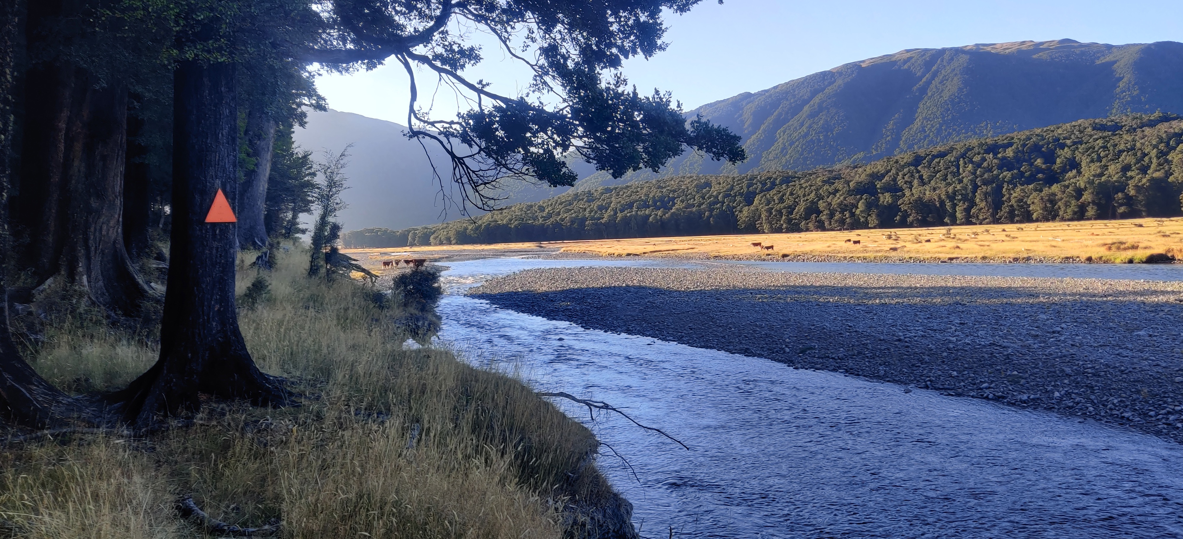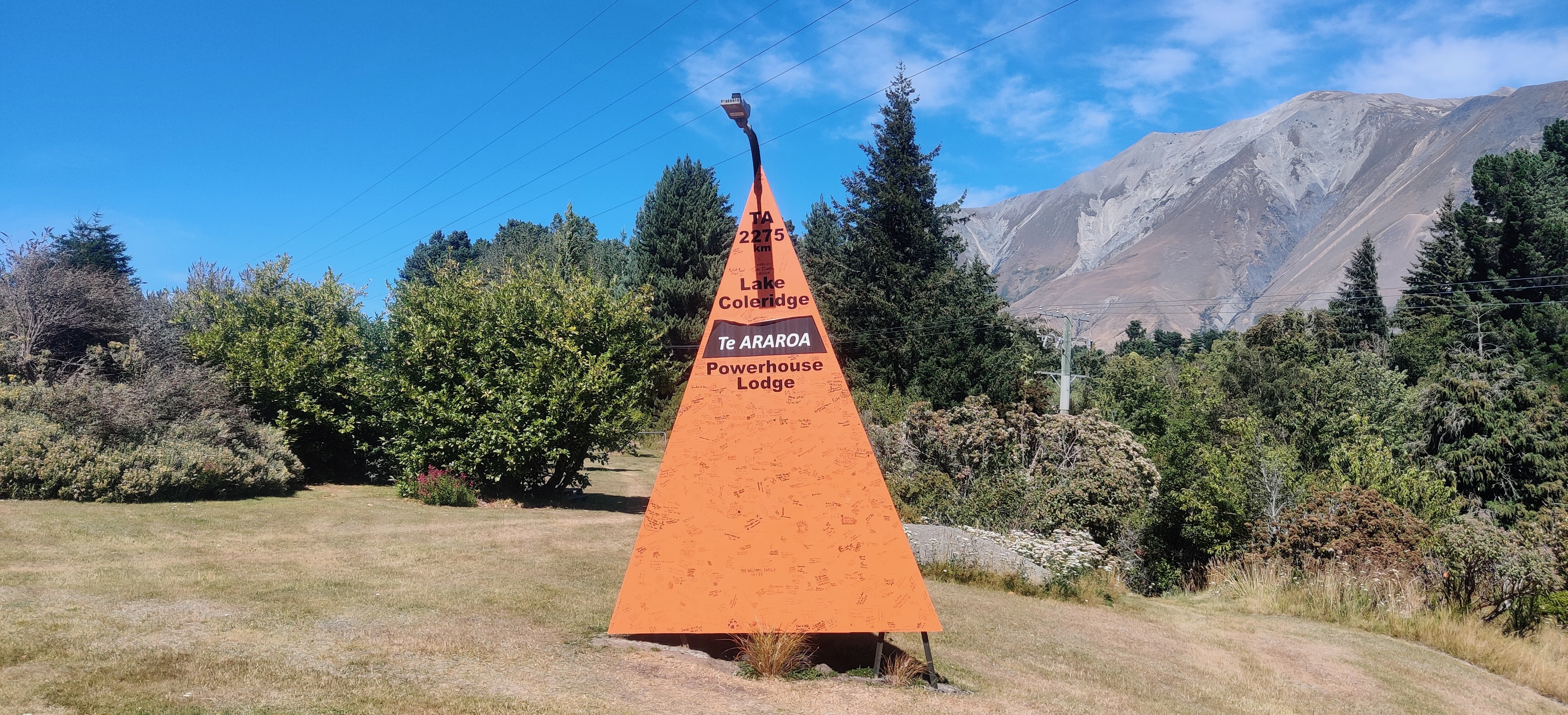 Who would have thought that hitchhiking from the main road near Methven could be harder than scoring a ride in Rachel’s truck the day before? Not me. And yet, there I was; standing for almost an hour, watching cars pass by every minute, all pretending I didn’t exist. Eventually, one kind soul stopped, and after one more hitch, I was back on the trail on the other side of the Rakaia River. The trail resumed next to Powerhouse Lodge, which is a former hydroelectric power station turned into accommodation, owned by a couple who had walked the TA themselves a few years earlier. The Powerhouse Lodge is legendary among TA hikers, thanks to the owners’ hospitality and the largest orange triangle marking the trail, proudly standing in their garden like a holy relic.
