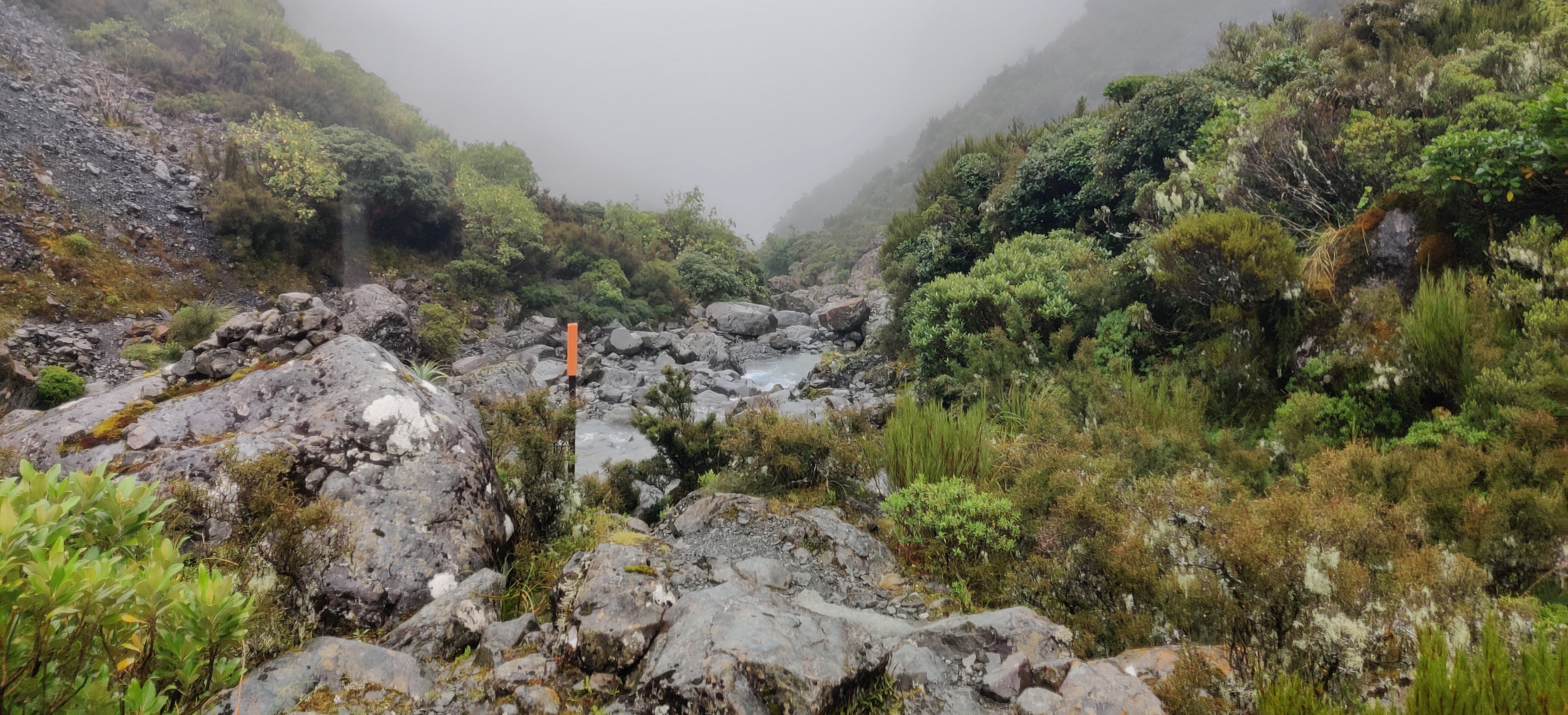 The trail was wet, and soon a light drizzle set in. By the time I reached the hut at Goat Pass, it was properly raining. This hut had one special feature: a radio that allowed to call directly to the Arthur’s Pass Information Centre. From there, hikers could check whether the Deception River was safe for hiking. I already knew it was fine because I’d met other hikers coming the opposite way but I was still tempted to try the radio. Because honestly, how often do you get to casually radio a mountain information center from the middle of nowhere?