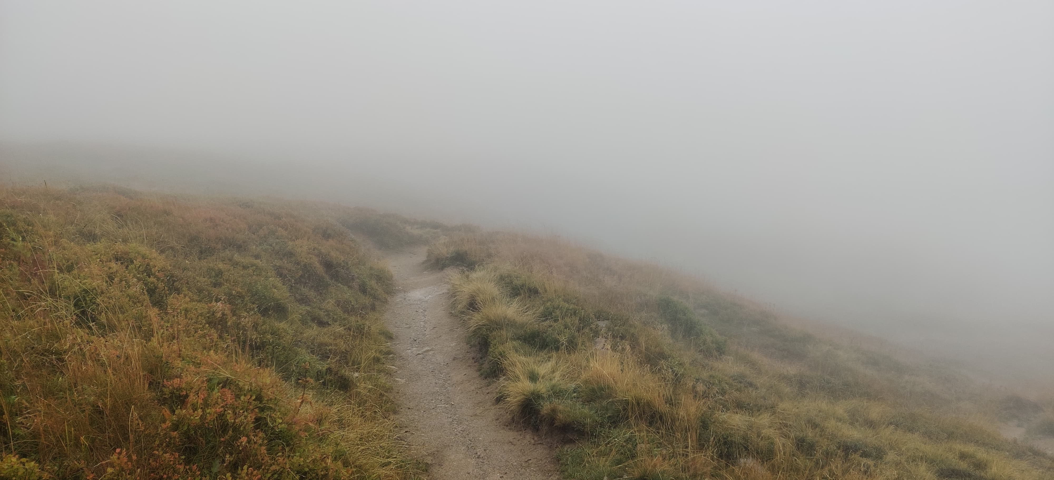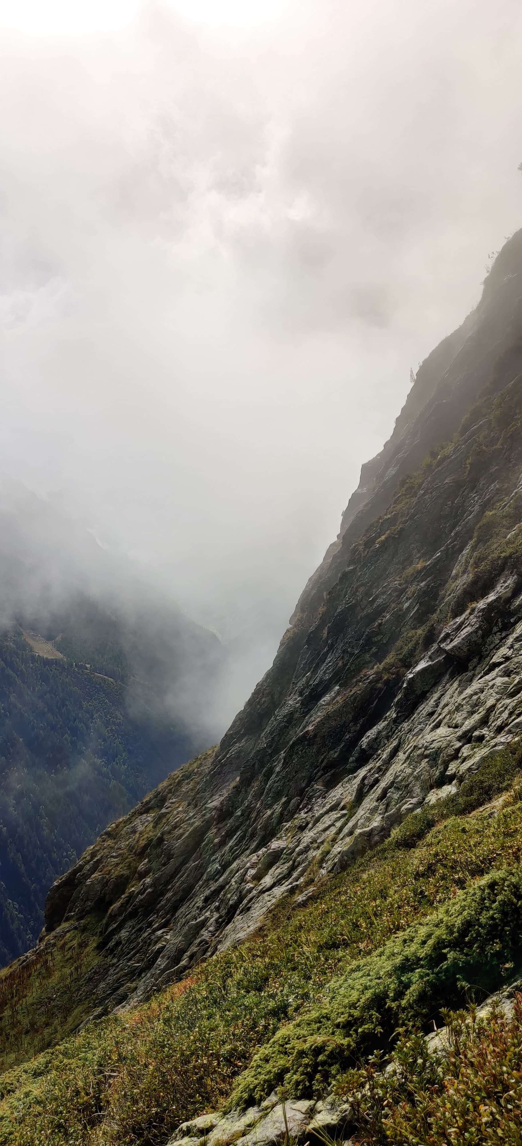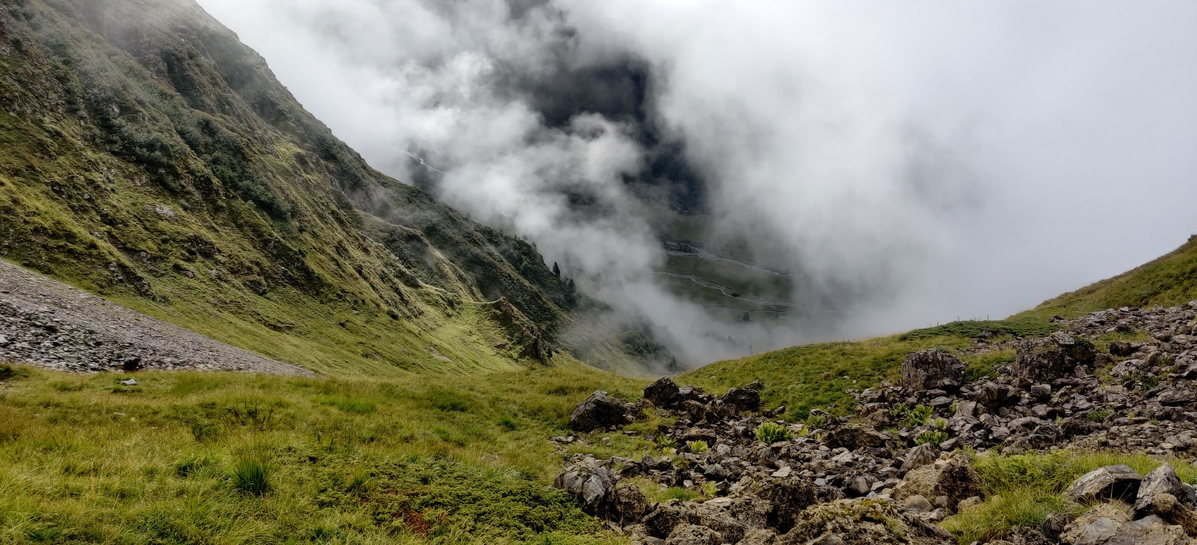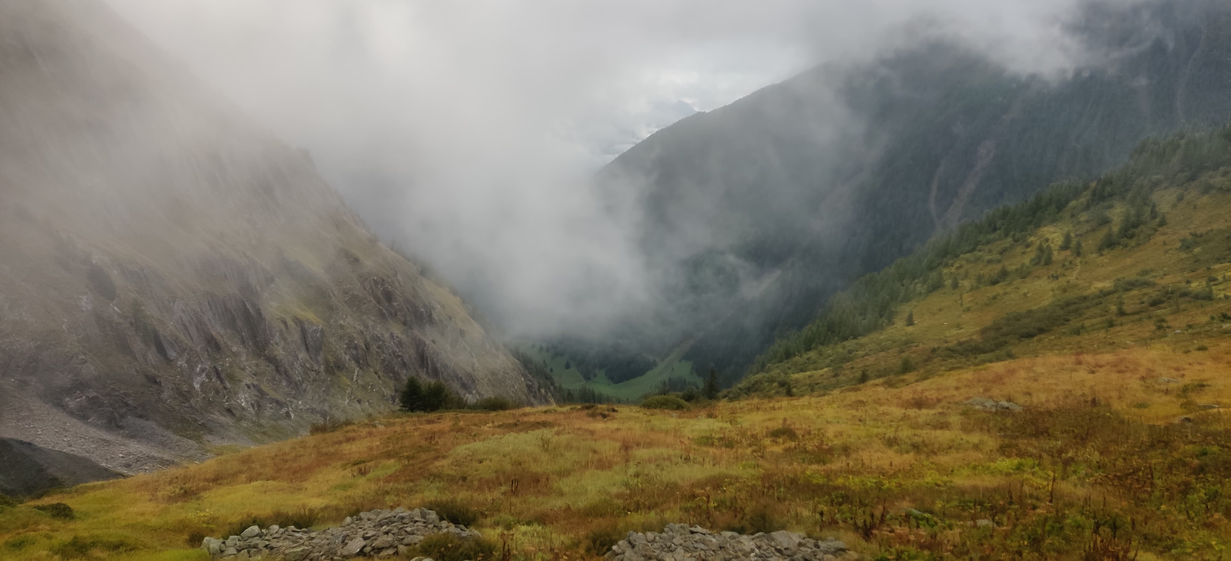 The climb to Col de la Balme was entirely in the rain. Once I got above the clouds, it turned foggy, windy, and noticeably colder. That was all the motivation I needed to push faster and get over the pass toward La Tour. Uphill I still felt strong, but downhill my quads and knees were definitely starting to complain.