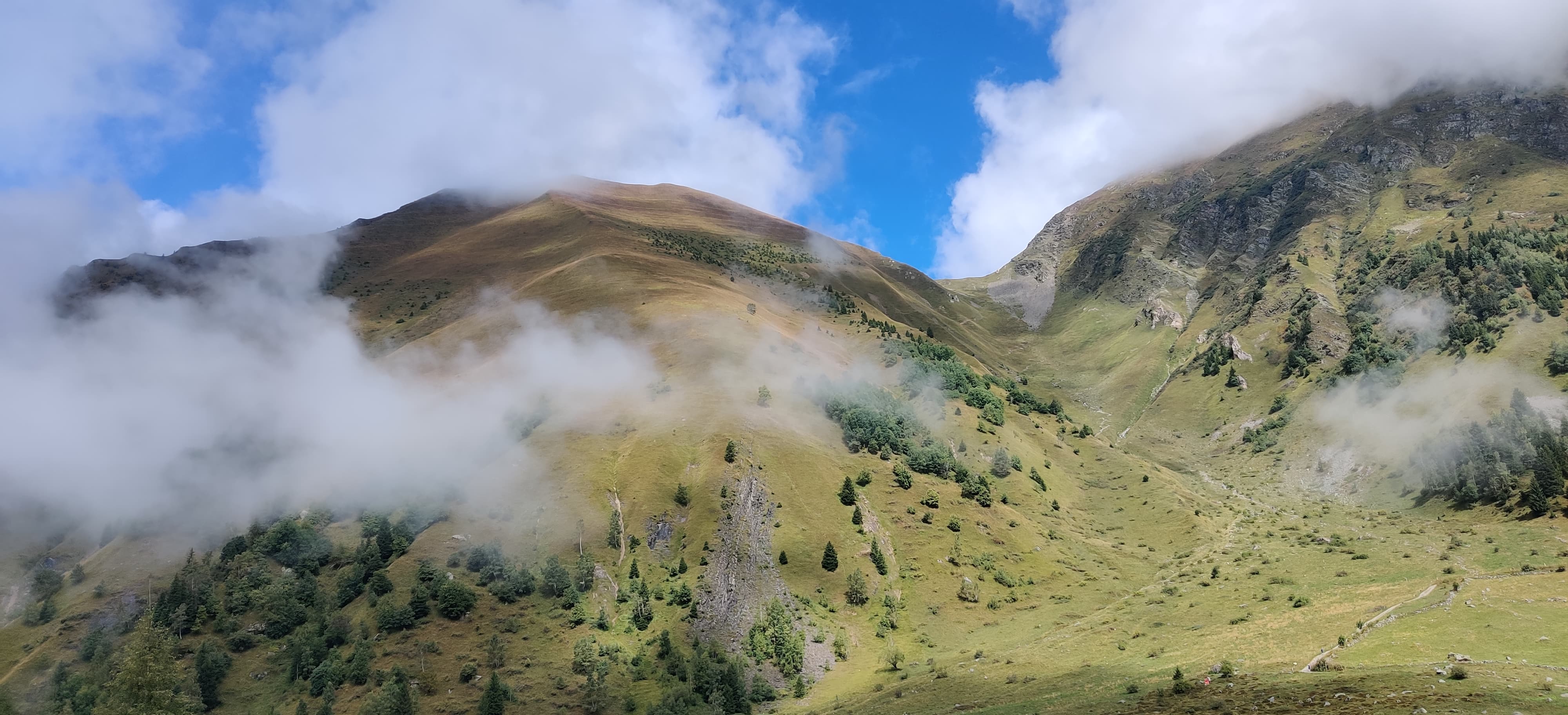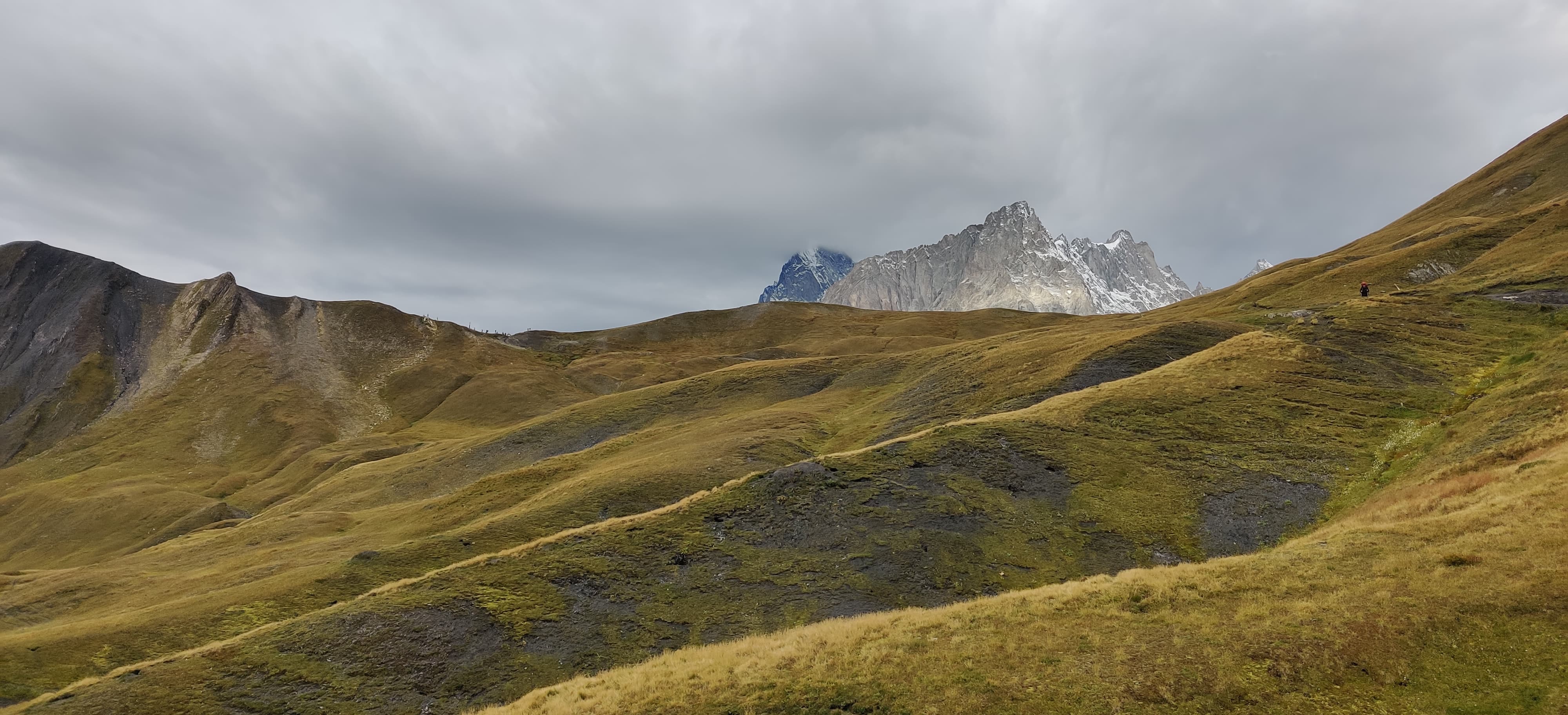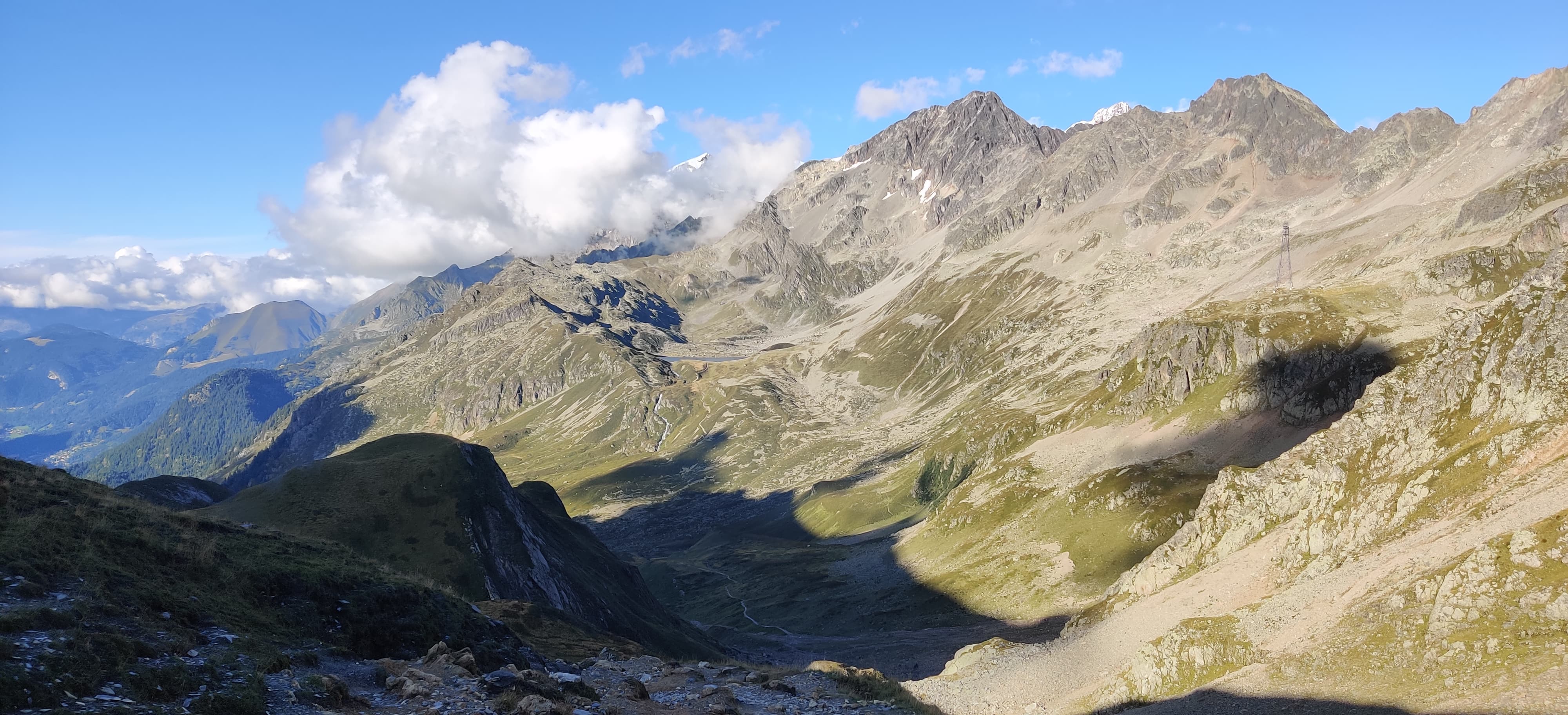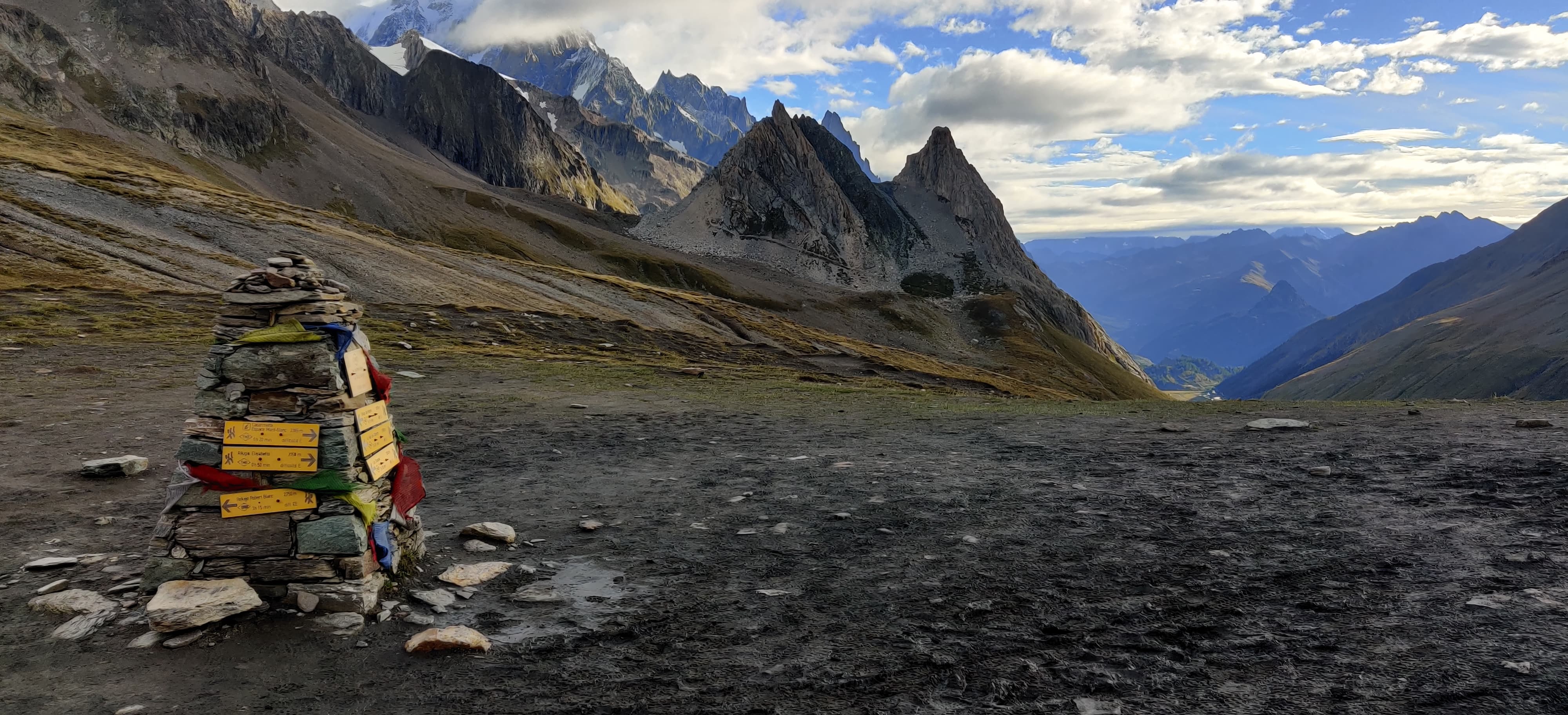 The next morning, I packed up my tarp and was happy to leave the spot behind. In daylight it became very clear I wasn’t the first person to camp there. The bushes decorated with toilet paper told the whole story. From there I began the climb to Grand Col Ferret, the mountain pass marking the trail’s entry into Switzerland. I overtook plenty of hikers who had stayed in the nearby hut, but by the time I reached the top, the crowds had thinned and I had the trail mostly to myself again. After snapping a few photos at the Swiss–Italian border, I started descending toward La Fouly.