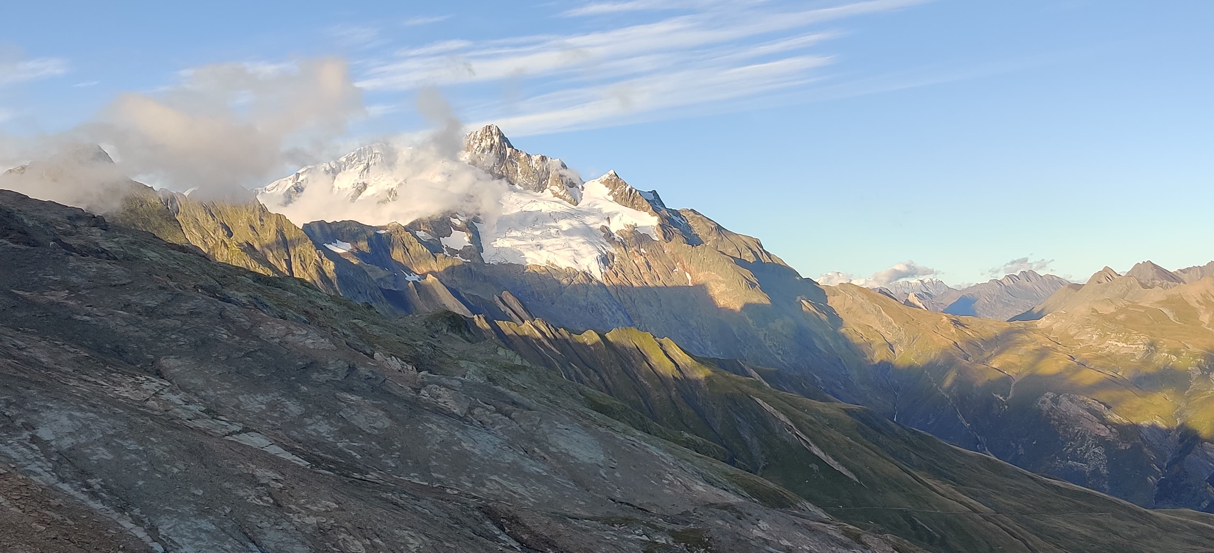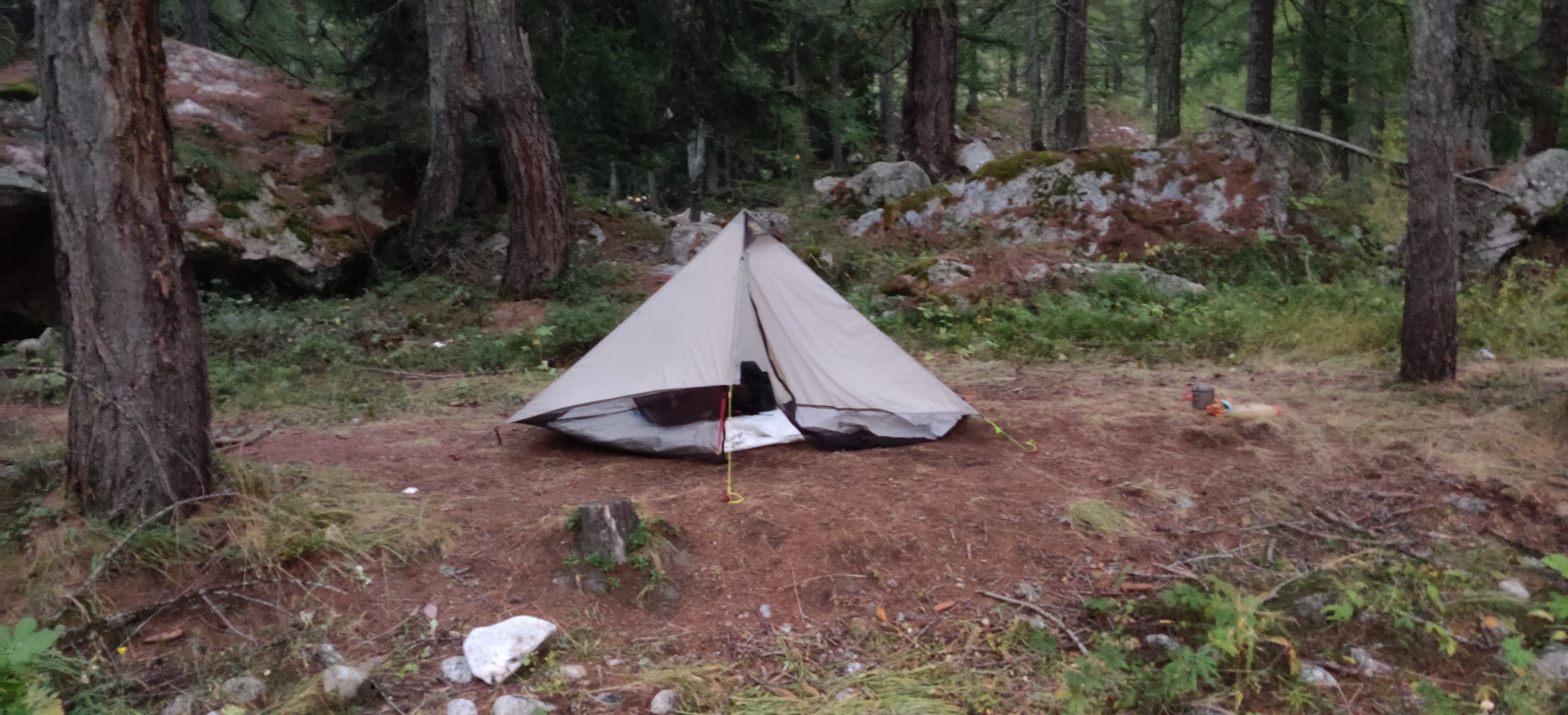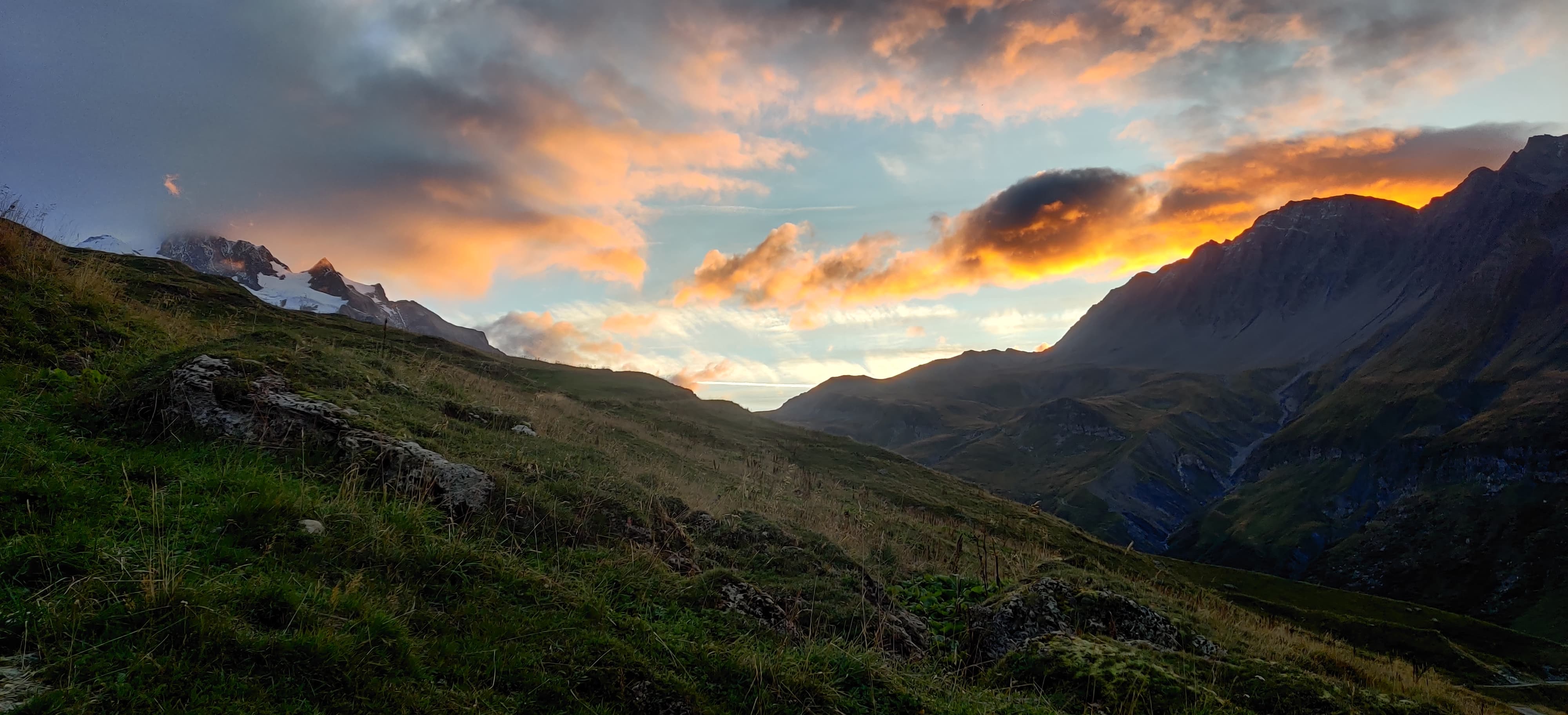 Right after crossing the saddle, I was rewarded with a beautiful view of the mountains glowing in the setting sun. For the first time that day, I even managed to spot a glacier in the Mont Blanc massif. As I descended into the much warmer valley below, I started looking for a spot to pitch my tarp. I wanted to camp as low as possible to avoid a cold night.