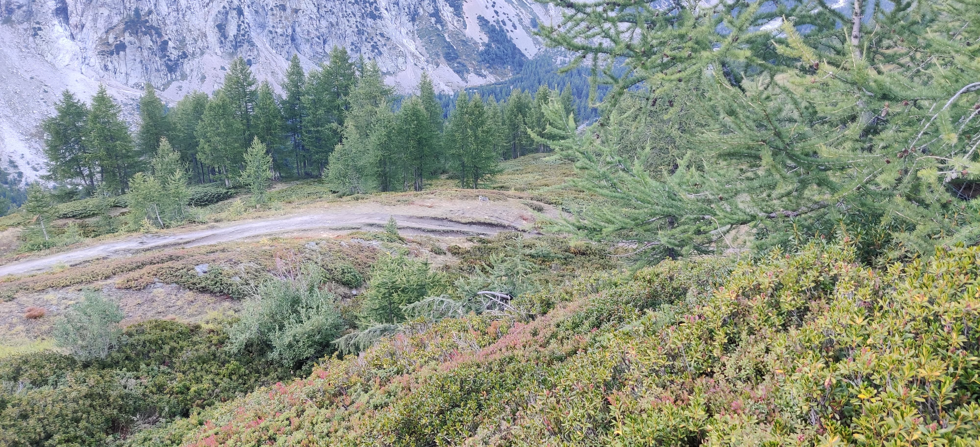 After my encounter with the pack animal MVP, I continued along a beautiful single track toward Chalet Val Ferret, where I planned to camp. I hardly saw anyone, except for one biker, and otherwise I had the valley, and the dramatic Grandes Jorasses towering above all, to myself. Usually I hike in silence, but that evening I put on a podcast for company. I was listening, looking around, when I suddenly froze. Something was standing on the trail about 70 meters ahead of me. At first I wasn’t sure what I was seeing, but then it clicked: a wolf.