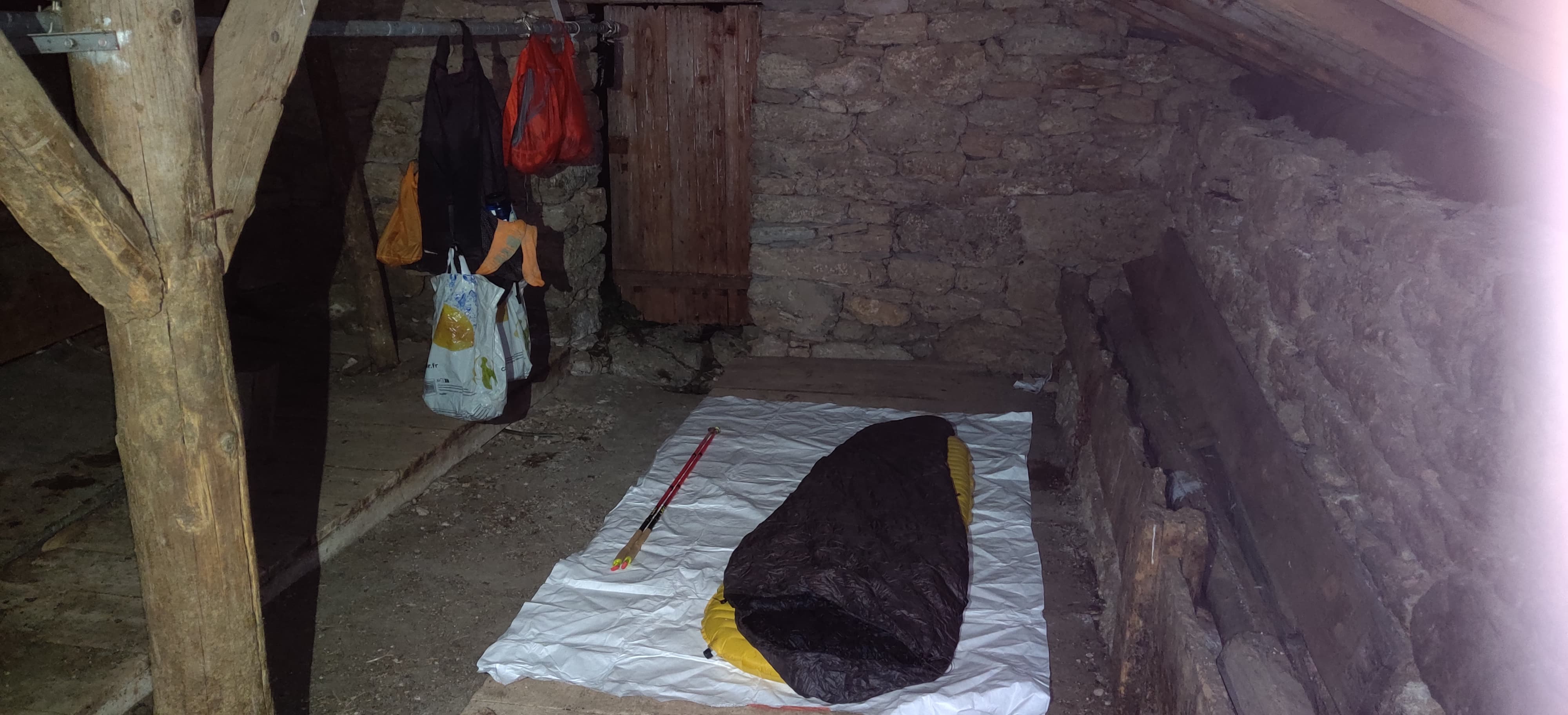 One mouse ran across the floor, clearly checking if I had dropped food, which made me a bit nervous. I didn’t want rodents keeping me awake, so I hung all my gear on a pipe in the middle of the barn and made a deal with the mouse not to bother me. It worked! I slept well, and in the morning, I left a small piece of baguette as rent for my little French roommate.
