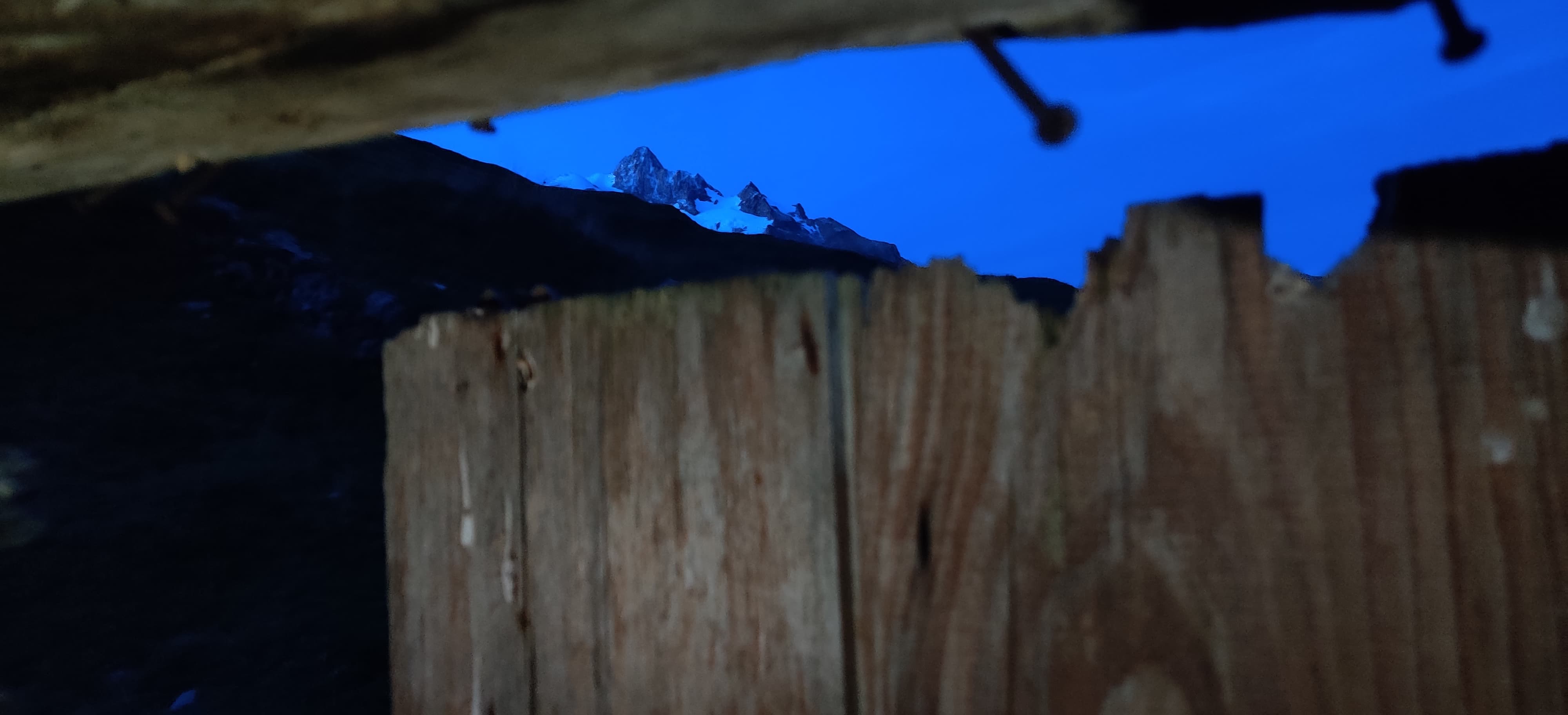 The wolf calmly walked onto the path where I had been standing just minutes before, still watching me. I quickly snapped a photo with my phone, then waited, hoping the wolf would continue minding its own business. Preferably business that didn’t involve me. After a few tense minutes, it wandered off, and I cautiously made my way back to the trail. I didn’t see it again, and by sunset I reached Chalet Val Ferret. I pitched my tarp in the forest near the Dora di Ferret river, cooked a quick dinner, and crawled into bed.