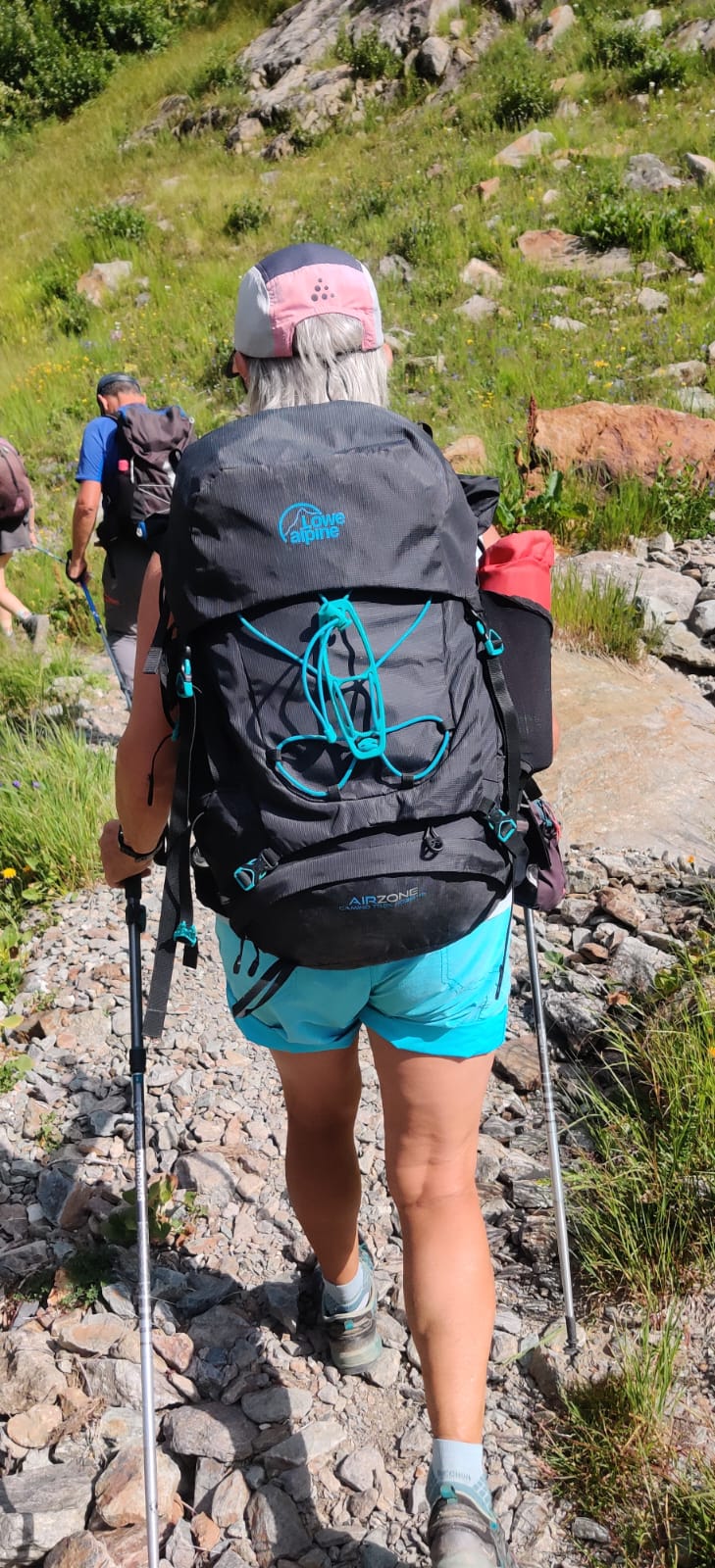 The climb out of Courmayeur to Rifugio Bertone was long-ish, but thanks to my pit stop in town, I felt great. It was still hot, but the sky was clear with no storms in sight, so I couldn’t complain. At the top, I took a short break to soak in the views of Mont Blanc and Col de la Seigne, which I had crossed just that morning. That’s one of my favorite feelings in the mountains: looking back at a place that seems impossibly far away and realizing it only took a few hours to get there on nothing but my own two feet, carrying everything I need on my back. Not everyone around me could say the same. I had just met a large guided group doing the TMB with no backpacks because they had a mule carrying everything for them. Now, the mule looked strong… but not particularly smart (sorry mule, no offense). It kept trying to wander off, only to be coaxed back by the guide waving a leafy branch like it was a carrot on a stick. Honestly though, if the mule knew how much weight it was hauling, it would probably feel way more badass than me.